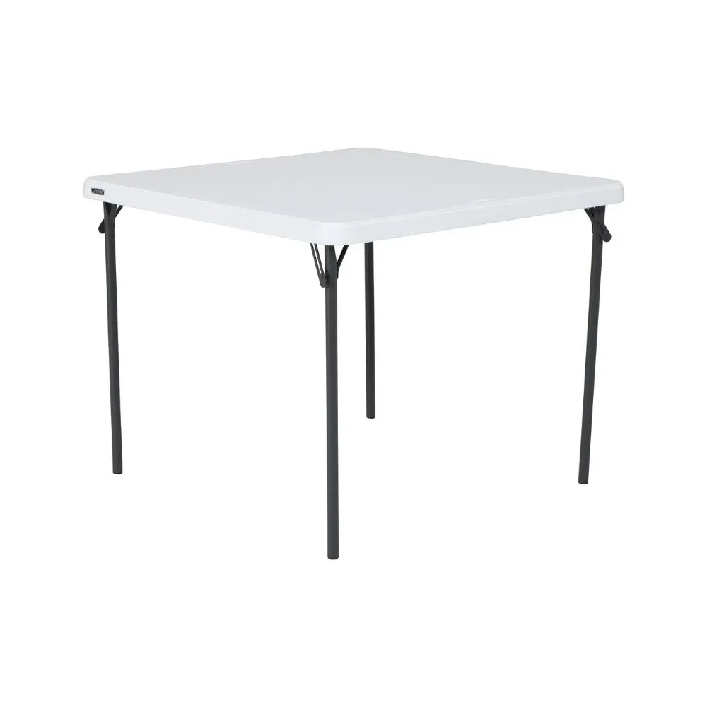 • High-density polyethylene collapsible table with powder coated steel frame.