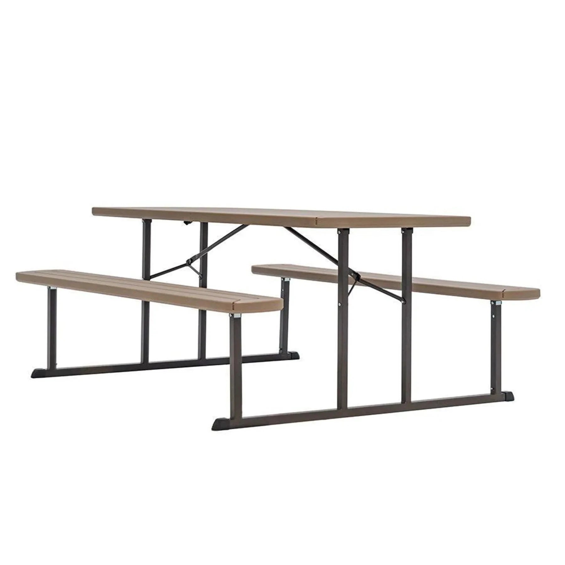 • Folding picnic table. Includes two integrated benches and a steel frame painted by spraying.
